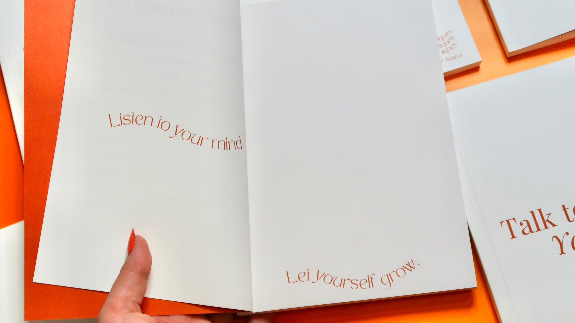 Talk to Your Mind is an interactive wellbeing journal- with dedicated spaces to both reading and writing, it is meant to prompt readers to "talk to their mind" through expressing their thoughts and "listen to their mind" by introspecting on what they have written.